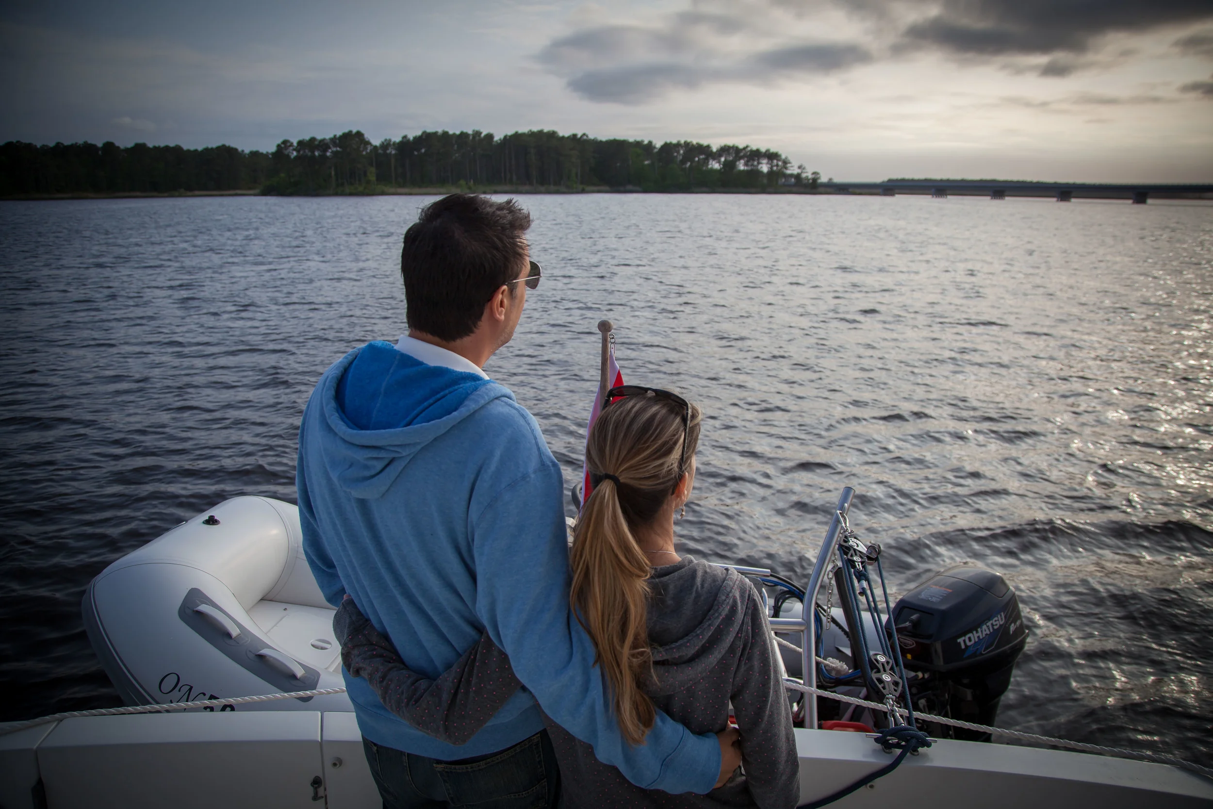 The next morning was sunny, warm and a beautiful cruising day. We got up bright and early with a plan to head up the Alligator River, cross Albemarle Sound to arrive in Elizabeth City for the evening. We had a lovely cruise up the river and entered the Albemarle Sound. We decided to take the C-Shel on plane to cross some of the Sound but as we did we lost our steering and almost ended up in crab pots. We for sure were shaken so we headed back to Alligator River Marina to recover and to find a solution to the problem.