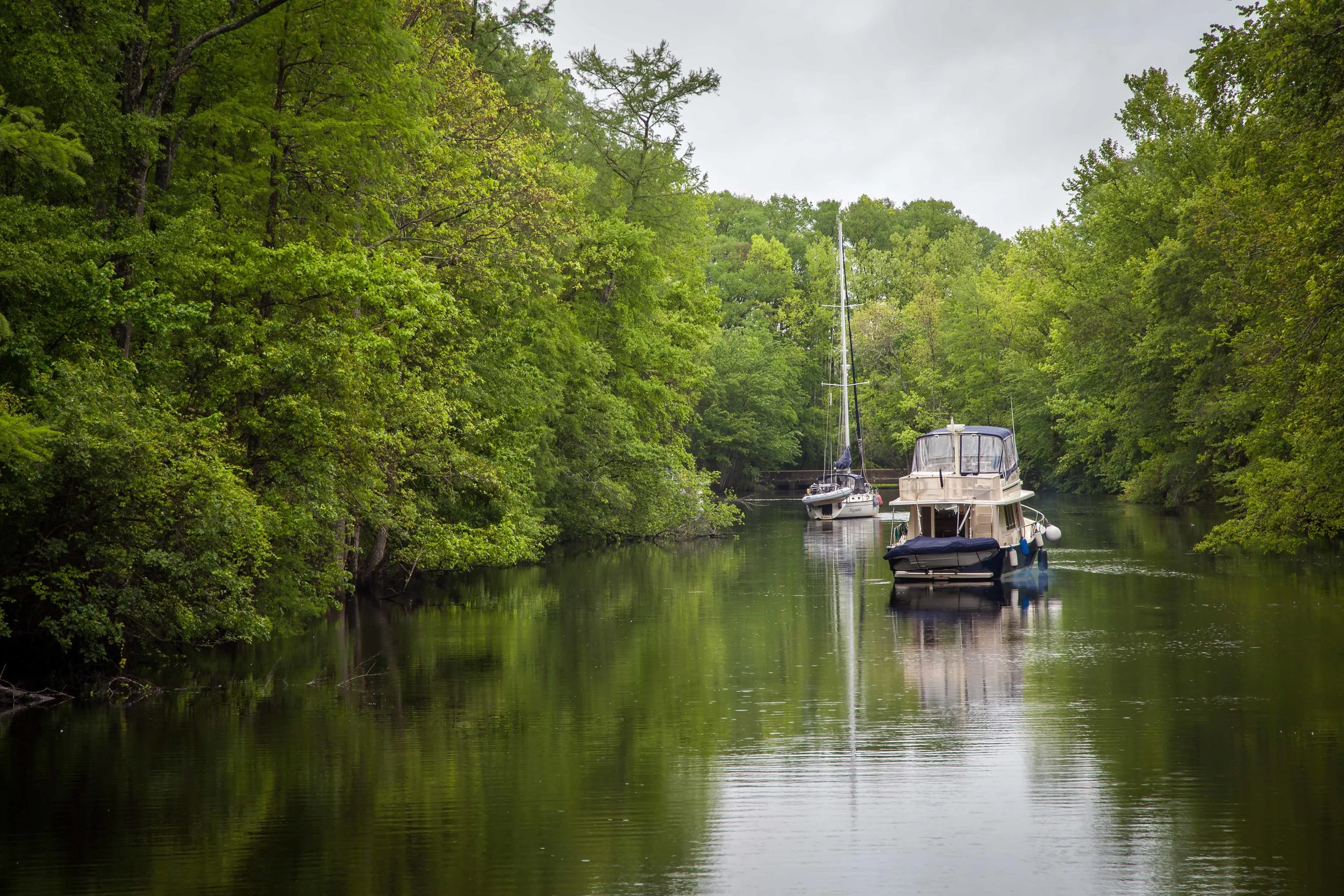 The next day we planned on going to Hampton, VA. We got through the bridge in Elizabeth City, NC at 7:30am in the morning and headed up The Great Dismal Swamp. The weather was rainy and very fitting for the lush surroundings of this beautiful river - it was almost mystical. As we headed deeper into the river we came upon the first lock of our trip - South Mills Lock. This lock was on a set time so we waited for the 11am opening. After the lock many of the boats that were with us on the way up through the river stopped at The Great Dismal Swamp visitors centre for the evening. We wish we could have checked it out as well but we are on a little bit of a time constraint which we know should never be on the water.