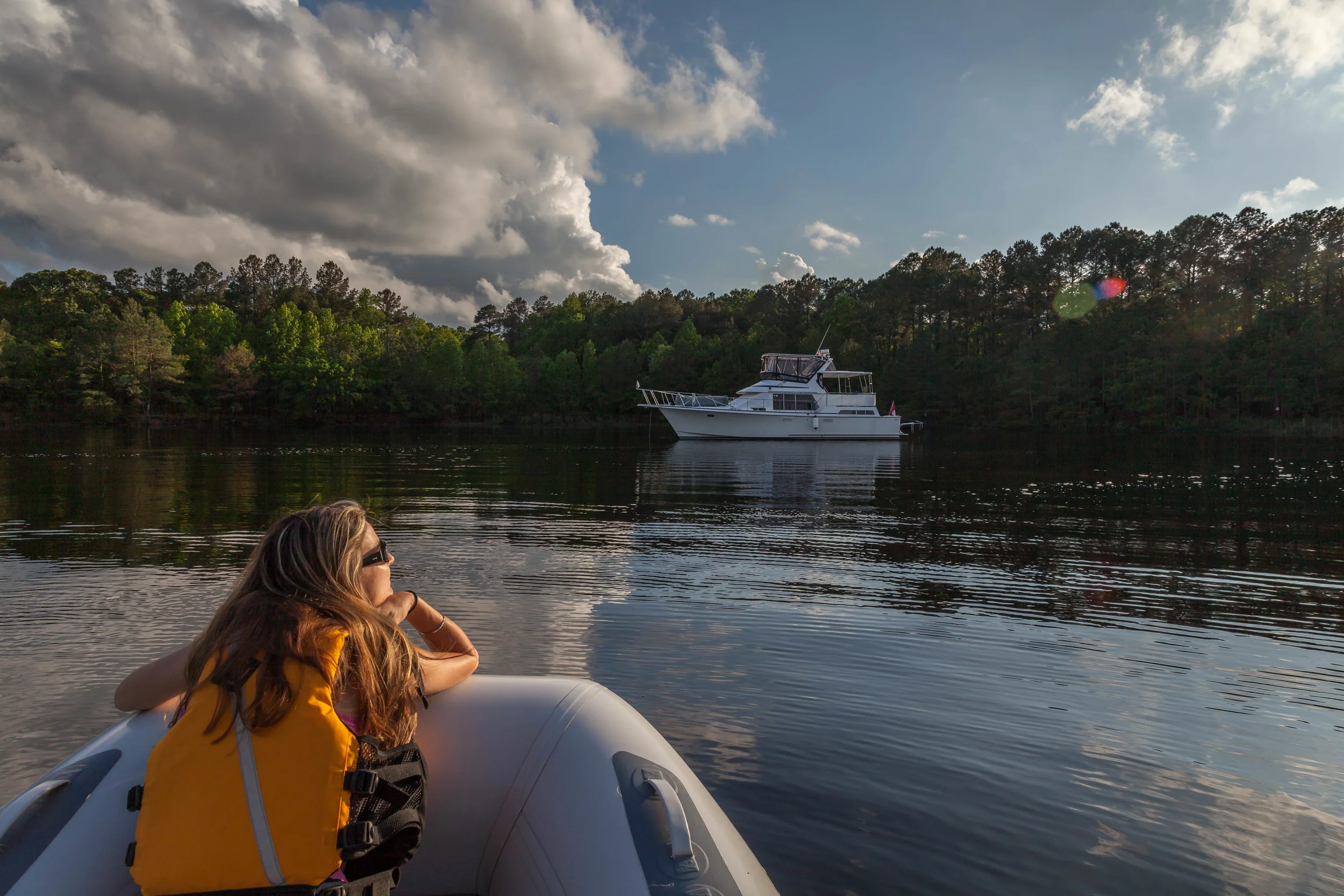 We continued on through the Swamp to the next lock - Deep Creek Lock which was also on a schedule of 3:30pm. As the day was longer than expected due to lock schedules, we decided to not proceed on to Hampton, VA and choose an Active Captain 5 star anchorage just below and around the corner from the Deep Creek lock. This was just a beautiful anchorage and we got to take our new dingy for ride.